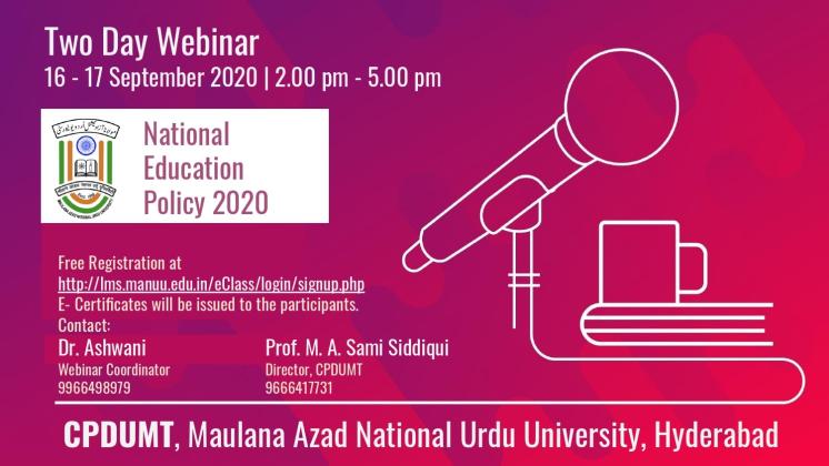 Govt. of India has recently come up with National Education Policy 2020. It is important for all stakeholders in the field of education to know about its various aspects so as to contribute to nation building through education. Keeping this in mind, CPDUMT, MANUU is organising a Two Day Webinar on NEP 2020.