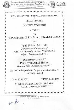Department of Public Admin & Legal Studies Invites you for a Talk on Opportunities in M.A (Legal Studies)