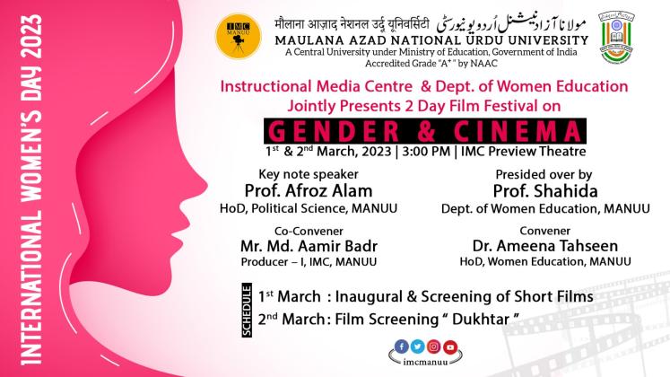 International women's Day. 2023, the Department of Women Education and IMC jointly organizing two days film festival followed by discussions on the theme "Gender and Cinema" on 1st & 2nd March ,2023 @ IMC preview Theater, MANUU.