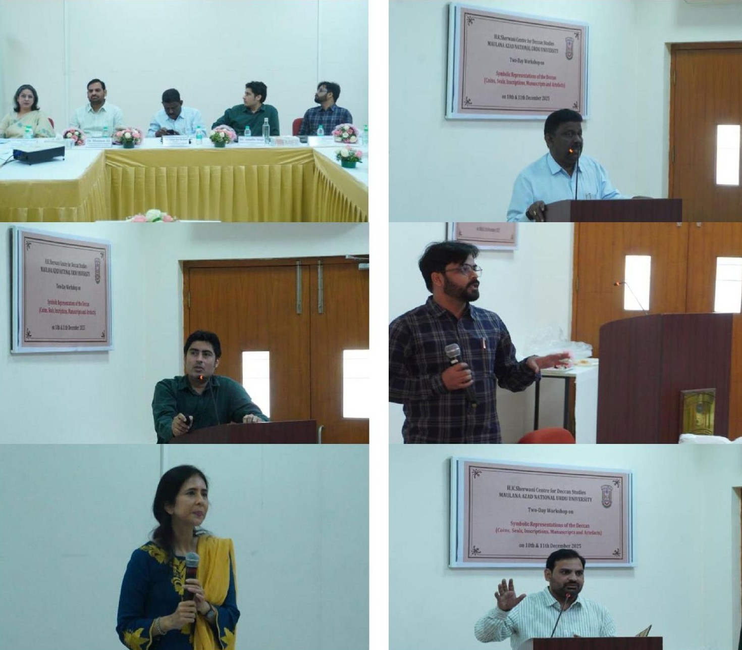 The H.K. Sherwani Centre for Deccan Studies organised a two-day Workshop on “Symbolic Representations of the Deccan (Coins, Seals, Inscriptions, Manuscripts and Artefacts)” on 10th-11th December 2025 with the aim of examining how the Deccan has been imagined, represented, and symbolised across time through coins, seals, inscriptions, manuscripts and artefacts. The workshop sought to understand symbols not merely as aesthetic forms but as carriers of political authority, cultural identity, and social meaning. The inaugural session was chaired by Prof. Arjun Rao Kuthadi, Director, Department of Heritage Telangana Government of Telangana who spoke about the importance of inscriptional and manuscript sources for the study of history. The resource persons included Mr. Amarbir Singh (Numismatist & Independent Researcher, Hyderabad), Dr. Ghulam Ahmad Raza (Assistant Professor, School of Arts and Social Sciences, Azim Premji University, Bhopal, Madhya Pradesh), Dr. Muntazir Ali (Assistant Superintending Epigraphist, Archaeological Survey of India) and Ms. Zeenath Khan (independent researchers, Hyderabad). The workshop witnessed the participation of 80 research scholars and post graduate students from diverse disciplinary backgrounds, including history, cultural studies, languages, and other social sciences and from University of Hyderabad, English and Foreign languages University, Osmania University other than Maulana Azad National Urdu University. Sessions focused on themes such as inscriptions, seals, manuscripts and archival sources of the Deccan. A distinctive feature of the workshop was its emphasis on discussion-based learning.