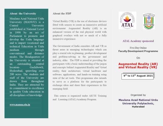 5 days Online AICTE-ATAL FDP on Augmented Reality & Virtual Reality by MANUU from 9th to 13th August 2021