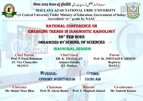 The Department of Vocational Studies and Skill Development, School of Sciences at Maulana Azad National Urdu University (MANUU) organized a one-day National Conference titled "Emerging Trends in Diagnostic Radiology" on February 26, 2025. The conference attracted over 150 participants from various universities and institutions across the country, showcasing its wide-reaching impact.